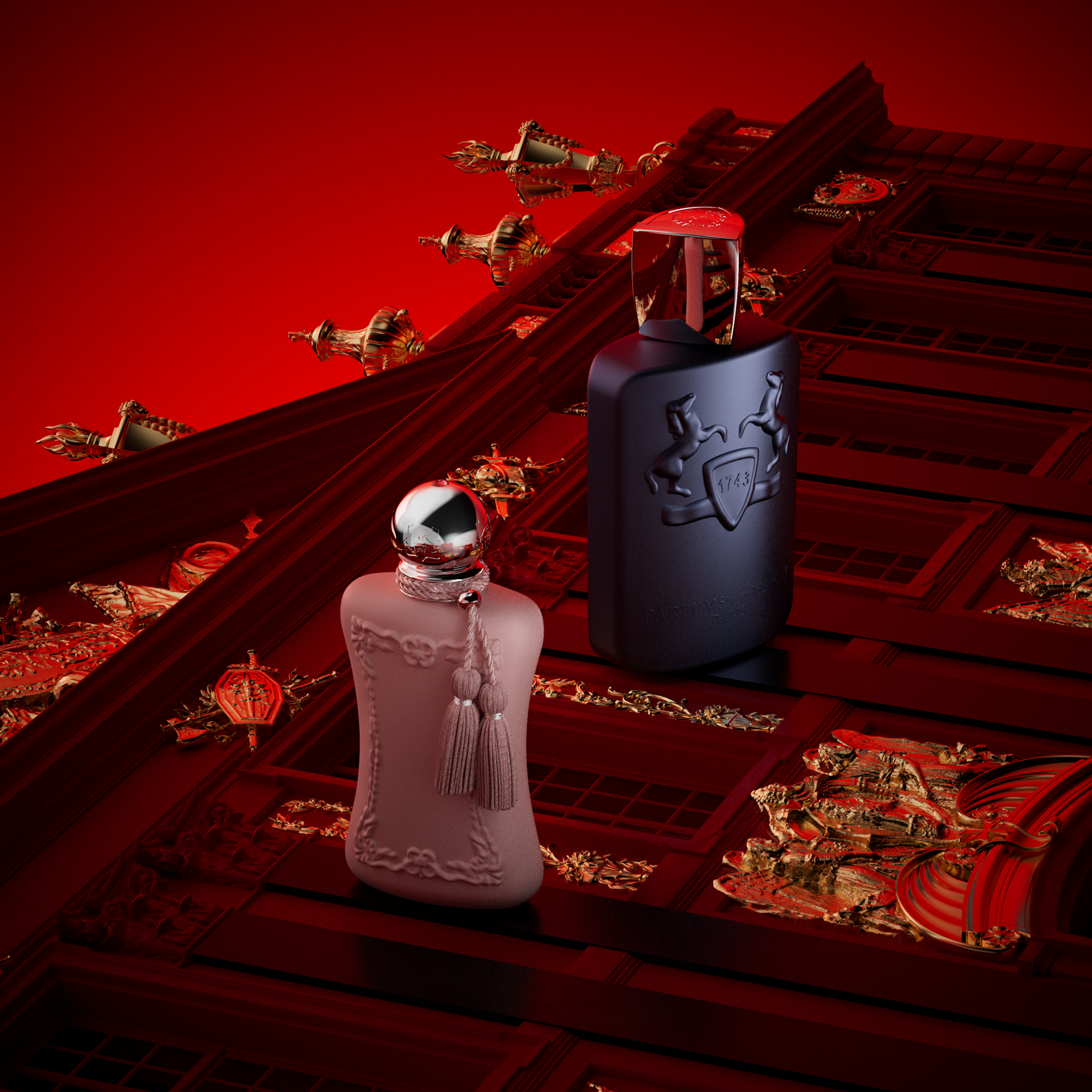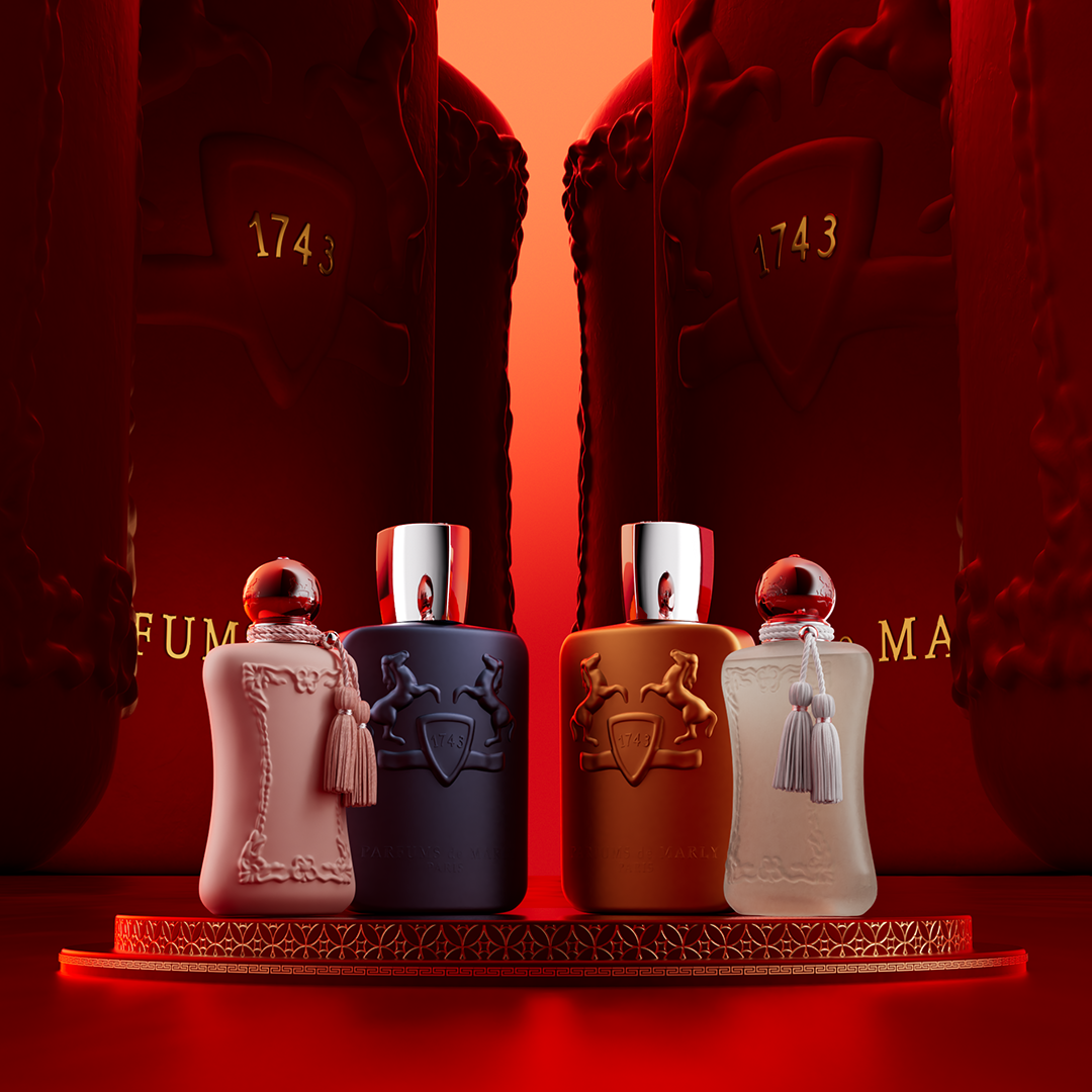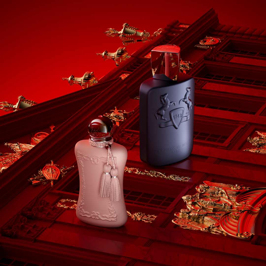 I crafted, with the creative team at Parfums de Marly, a short movie, entirely designed in 3D, and 10 visuals showcasing the brand's flagship products in a red and gold setting, reflecting the brand's elegance and prestige.