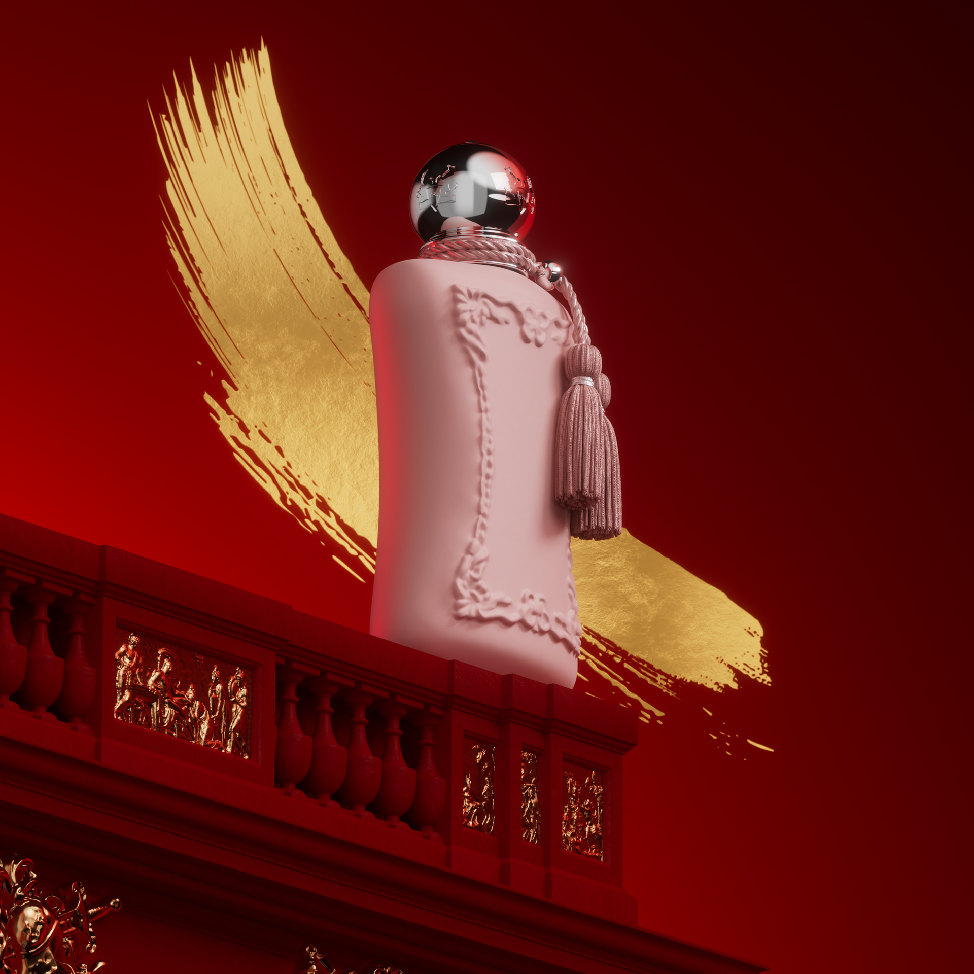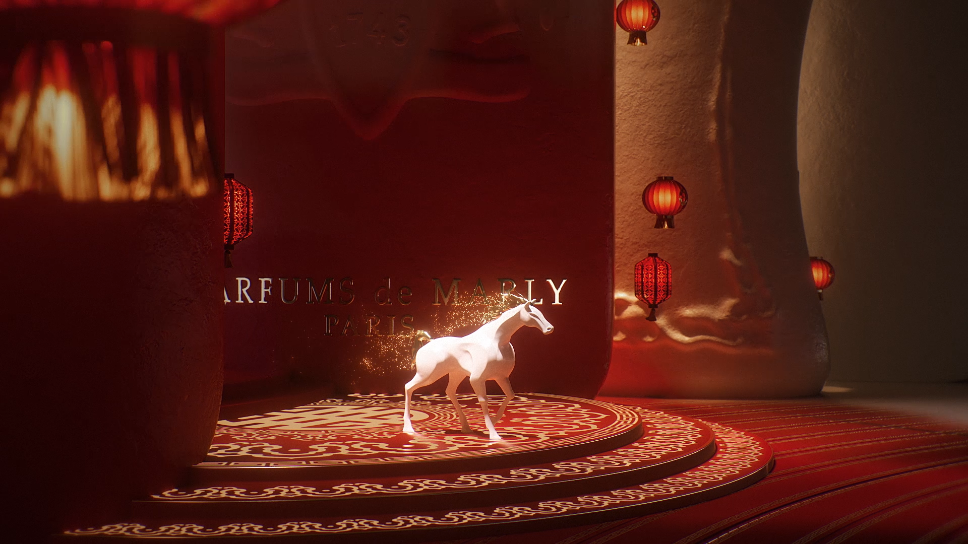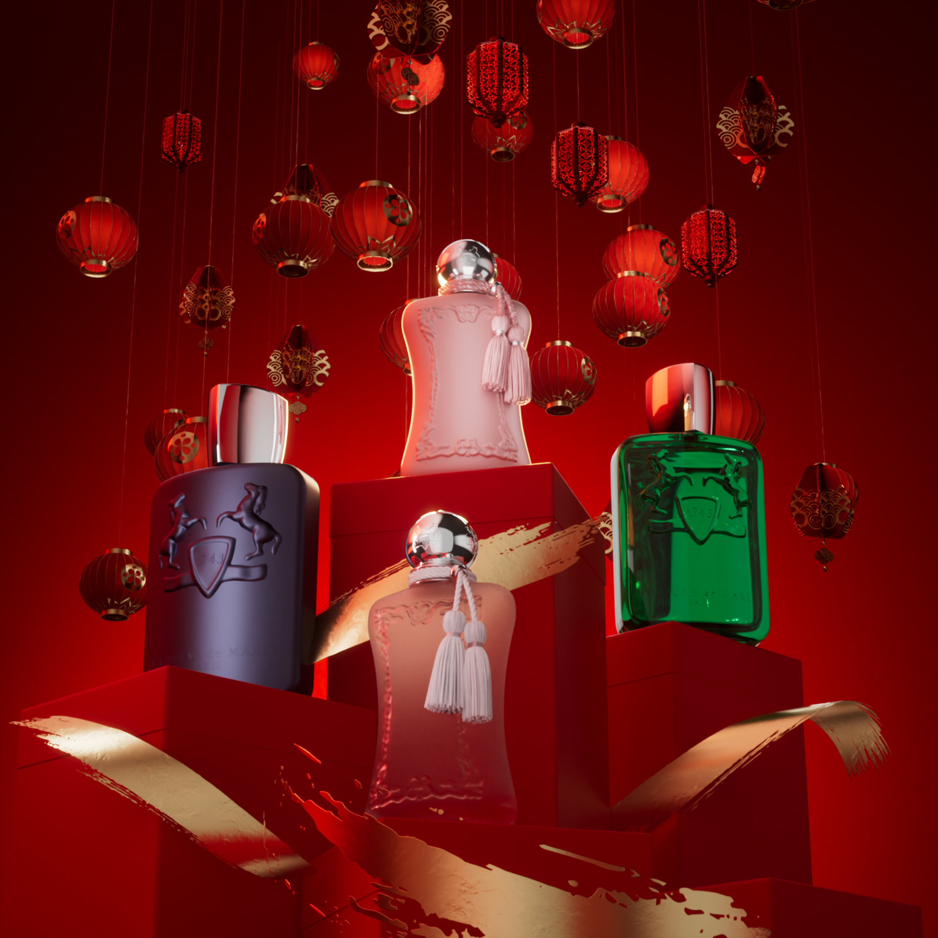 I crafted, with the creative team at Parfums de Marly, a short movie, entirely designed in 3D, and 10 visuals showcasing the brand's flagship products in a red and gold setting, reflecting the brand's elegance and prestige.